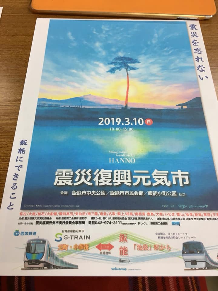 2018年11月23日 / 最終更新日時 : 2018年11月29日 sekitanaoko なおこのはんのう日記 第8回震災復興元気市の準備がはじまりました! 昨夜は震災復興元気市実行委員会に参加させていただきました。 次回で8回目を迎えます。 まだ、日常を取り戻せていない人々に飯能から少しでも明るい希望を届けていきたいと思います。 2019年3月10日(日曜)中央公園(市民会館横の駐車場)を中心に行われます。 この夜の会議は、建て替えのために引っ越しが始まっている”現”飯能商工会議所での最後の会議でした。 飯能の歴史の1ページに立ち会うことができました。新しい建物が待ち遠しいですね! Follow me! BlueskyCopy