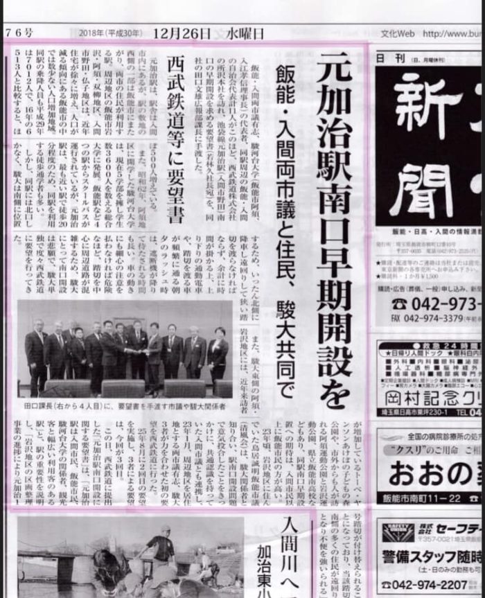 2018年12月26日 / 最終更新日時 : 2019年1月31日 sekitanaoko なおこのはんのう日記 元加治駅南口開設に関する動き 元加治駅南口開設の要望書提出に関する記事が文化新聞に掲載されました。 Follow me! BlueskyCopy