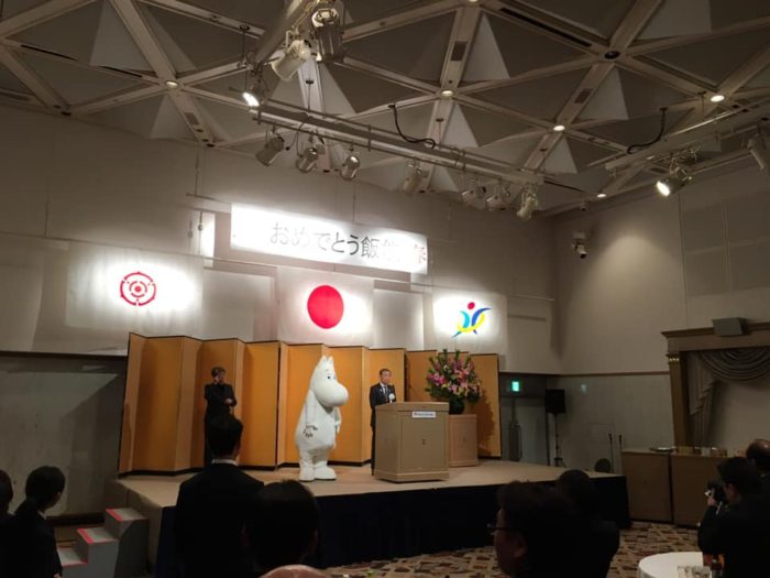 大久保市長の話をジッと聞いているムーミン、