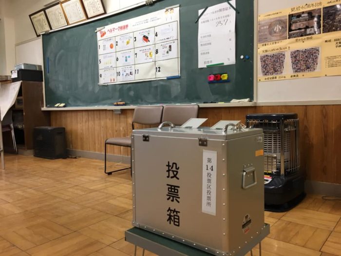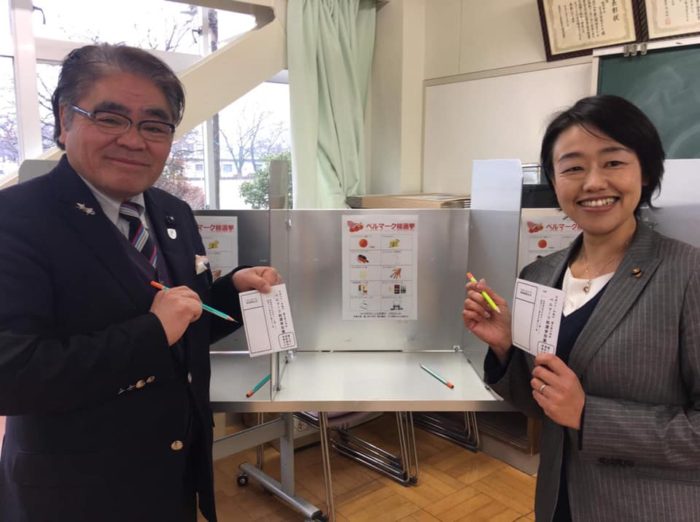 我々議員の選挙にも使われる記入台と投票箱を配置して、