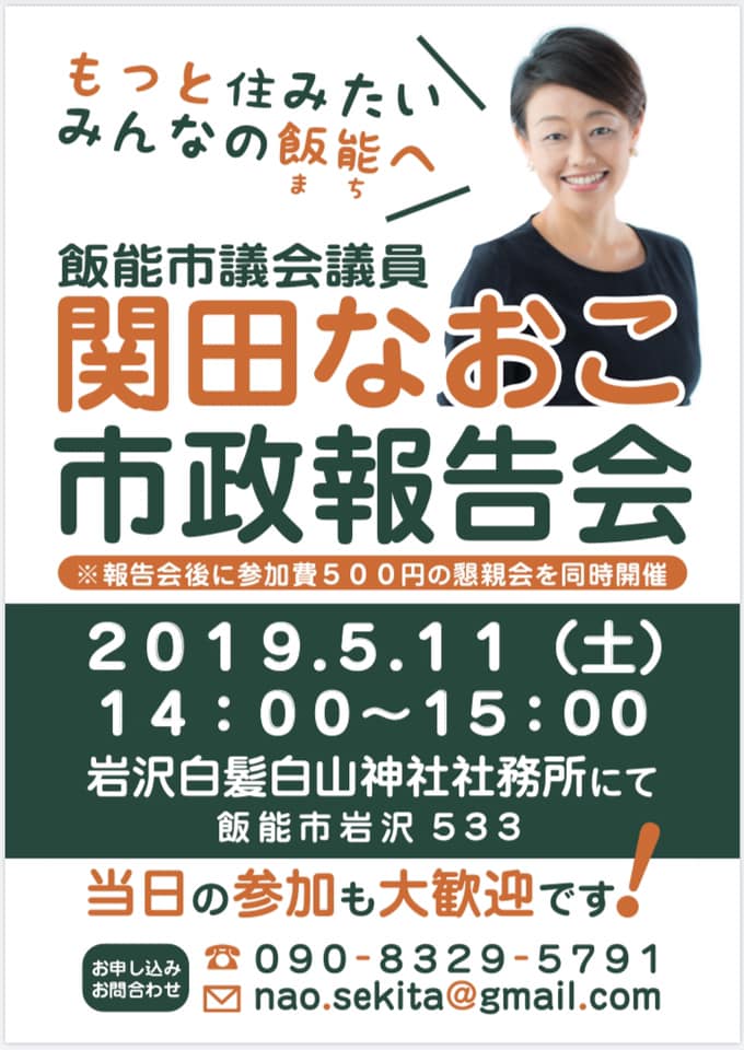 2019年4月19日 / 最終更新日時 : 2020年6月27日 sekitanaoko なおこのはんのう日記 関田なおこ市政報告会開催のお知らせ 「もっと住みたいみんなの飯能(まち)へ」 関田なおこの市政報告会を行います。 連休明けのお忙しい日とは存じますが、 お誘い合わせの上、お越し下さい。 みなさまのご来場を心よりお待ち申し上げます。 ****************** 日時:令和元年5月11日(土) 14:00~15:00 場所:岩沢白髪白山神社社務所 ※区画整理事業開始に伴い、駐車場は非常に少ない状況です。なるべく乗り合わせでご来場ください。 Follow me! BlueskyCopy