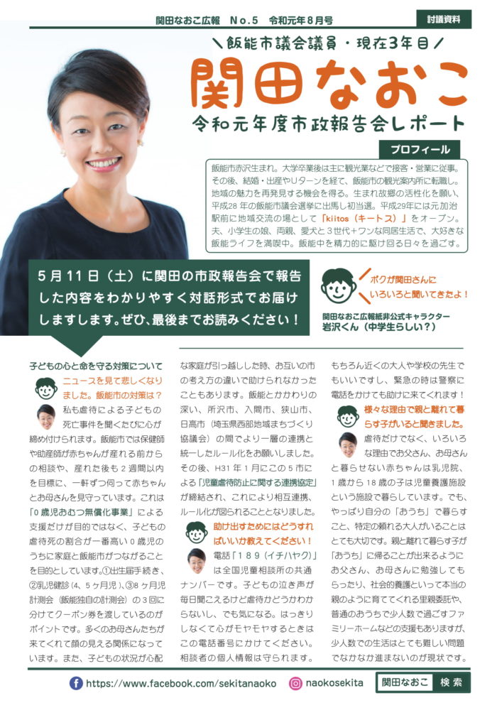 5月11日に開催させていただきました、関田なおこの令和元年度市政報告会の様子をまとめた資料を作成しました。下記リンクからPDFでダウンロードできますので、ぜひ、ご覧ください!