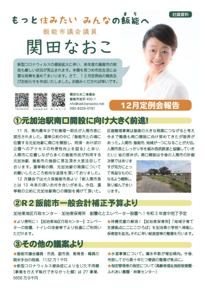 2021年1月4日 / 最終更新日時 : 2021年1月16日 sekitanaoko お知らせ 12月議会のレポートを作成しました 12月定例会報告を作成致しました。地元中心に配布中です! 下記URLアドレスからPDFでもご覧いただけます。 ぜひ、ご一読ください 定例会報告_202012ダウンロード Follow me! BlueskyCopy