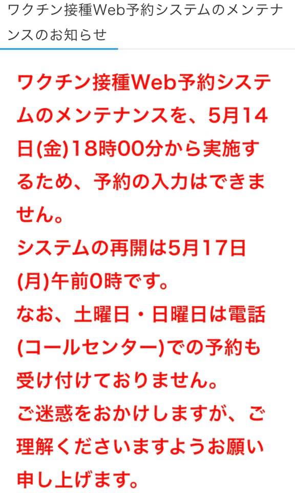 2021年5月15日 / 最終更新日時 : 2021年5月23日 sekitanaoko なおこのはんのう日記 飯能市のワクチン接種Web予約システムがメンテナンス中です 昨夜、今朝と防災無線及び広報車でお伝えしているようですが、現在Web予約が出来ない状態です。 御理解の程お願い致します。 ************飯能市HPより************ ワクチン接種Web予約システムのメンテナンスを、5月14日(金)18時00分から実施するため、予約の入力はできません。システムの再開は5月17日(月)午前0時です。なお、土曜日・日曜日は電話(コールセンター)での予約も受け付けておりません。ご迷惑をおかけしますが、ご理解くださいますようお願い申し上げます。 Follow me! BlueskyCopy