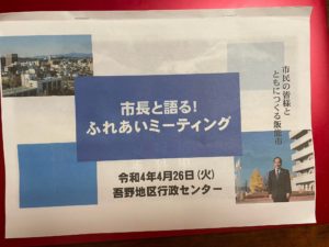 今回は関田が所属する ネクストはんのう が議会で取り上げた内容やR4年度予算概要、各地区重点政策、「市長と語る!ふれあいミーティング」の内容のご報告とさせて頂きます。