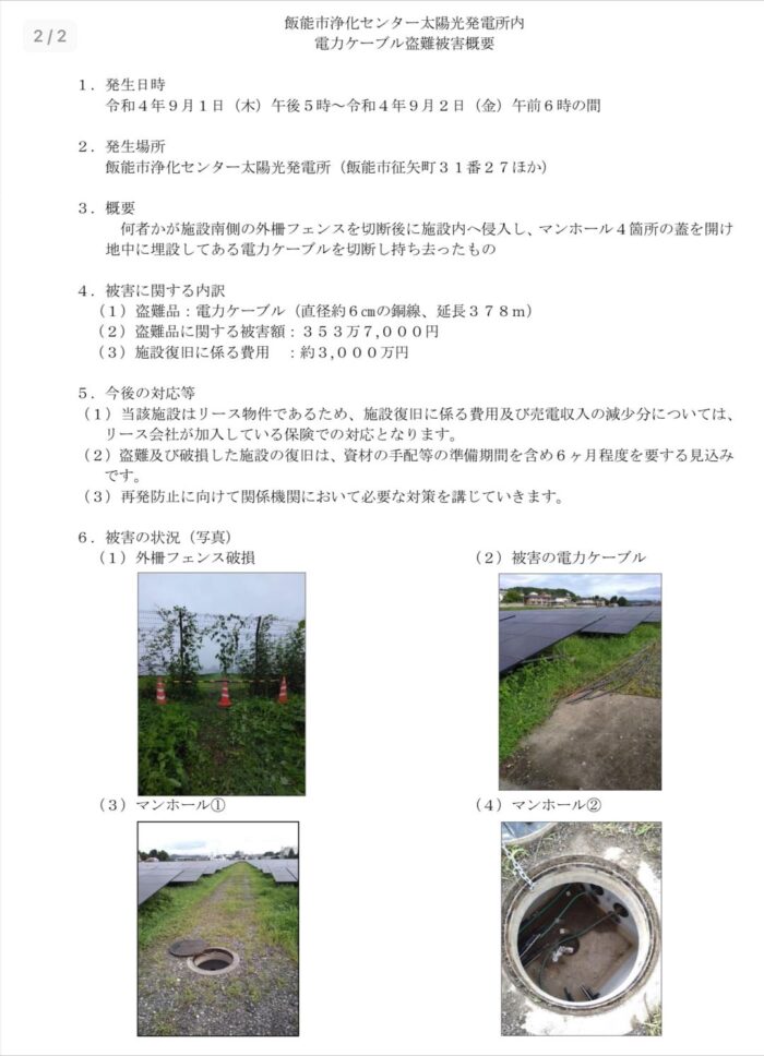 飯能市浄化センター太陽光発電所電力ケーブル盗難について