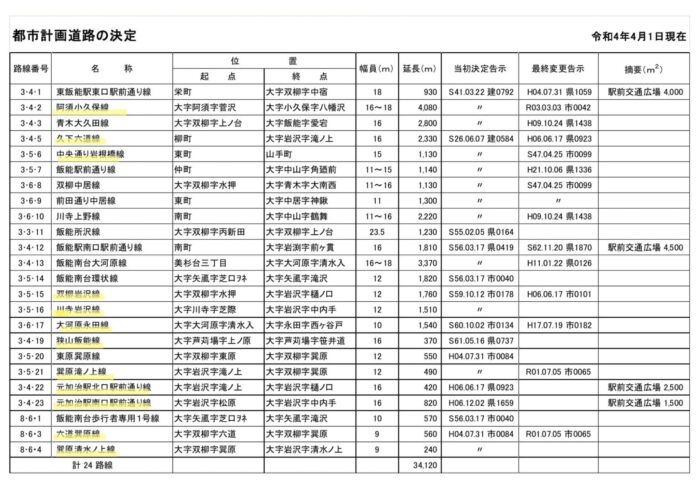 ※ちなみにですが、飯能にある都市計画道路一覧の画像もアップします。黄色のマーカーが一部整備、未整備等、まだ終えていない道路です。