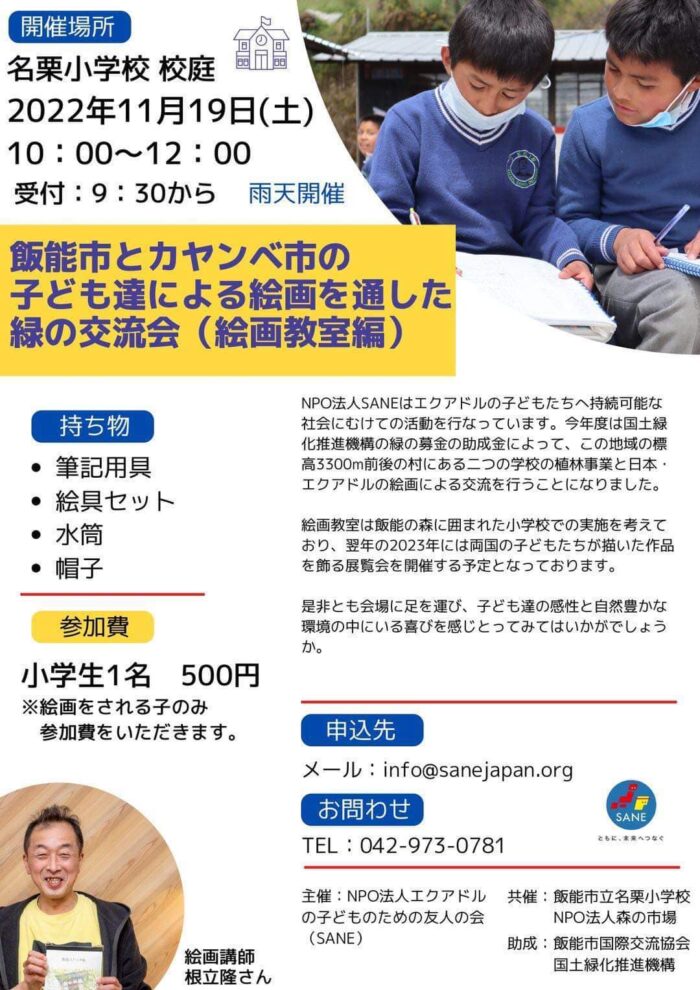 2022年10月30日 / 最終更新日時 : 2022年11月4日 sekitanaoko なおこのはんのう日記 【NPO法人SANE】「森の中の絵画教室」のお知らせ NPO法人SANEさんのイベントを紹介します! 飯能ではご存知の方も多いかと思いますが、 エクアドルの子供たちを応援するSANE。 来年開催の両国展覧会に向けて絵画教室を開催します。 講師は飯能在住の根立隆さんです ただ今、参加者募集中です! 青空の元でどんな絵が完成するのか楽しみですね。 Follow me! BlueskyCopy