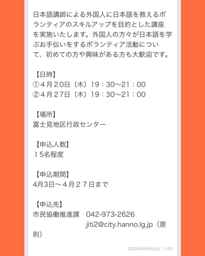 2023年4月17日 / 最終更新日時 : 2023年4月21日 sekitanaoko なおこのはんのう日記 日本語でコミュニケーション! 日本語でコミュニケーション! ~日本語教室スタッフ養成講座~ 多方面の方から、私の経験からも、 外国人とのコミユニケーションに困る、や せっかくなら地域に溶け込んで欲しい、等の ご意見を聞くことがあります。 実際、岩沢でも まずは外国人の方と話してみようという グループも立ち上がりました。 少しだけ興味がある方でも大丈夫だそうですよ。 基本、2回連続講座です。 Follow me! BlueskyCopy