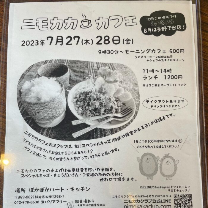 2023年6月29日 / 最終更新日時 : 2023年7月12日 sekitanaoko なおこのはんのう日記 今日のランチはニモカカ・カフェへ 今日のランチはニモカカ・カフェへ 月に2日間の楽しみとなりそうです お店に入った時から焼き鳥の芳ばしい香りがふわ~っと。 竹のお弁当箱?に入ったラオスのもち米も ラオスのコーヒーもとても美味しかったです! モーニングタイムもオススメとの事ですよ たくさん食べて飲んで応援します! 柳戸さんが主催されてる 大人の朗読会からのご寄付を ニモカカの和田さんにお渡ししているところ。 なんと、今朝も柳戸さんにお会いしたばかり。 運命?らしくランチも偶然、同時刻に同じ場所に! Follow me! BlueskyCopy
