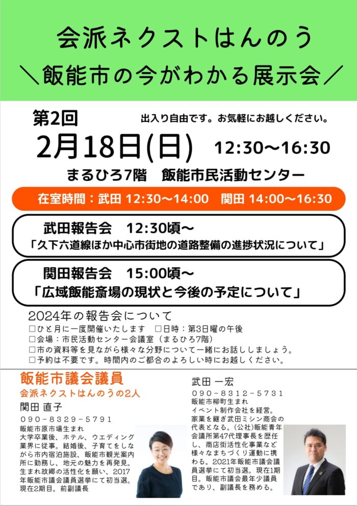 2024年2月7日 / 最終更新日時 : 2024年2月11日 sekitanaoko なおこのはんのう日記 2月のネクストはんのう報告会 今月は2月18日に開催いたします。 場所は まるひろ7階市民活動センターです。 始めて早々ですが、各々所用で 武田は12:30~14:00 関田は14:00~16:30 と、入れ替えで滞在しております。 そしてそれぞれ報告会も開催致します。 是非お越しください! Follow me! BlueskyCopy