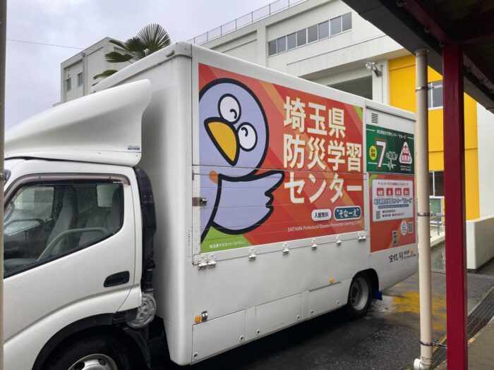 市役所のご厚意で地震体験車も用意くださいましたが雨が強くて断念。