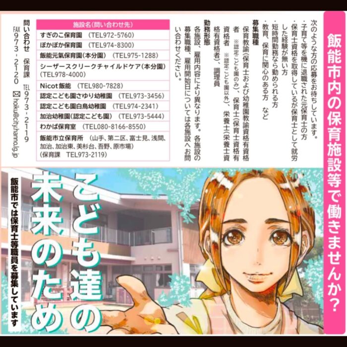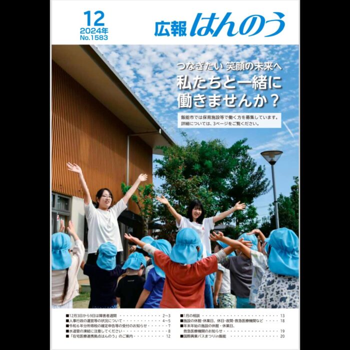 2024年12月11日 / 最終更新日時 : 2024年12月15日 sekitanaoko なおこのはんのう日記 飯能市の子供の未来を作るお仕事をしませんか!? 今月の『広報はんのう』の表紙です。 青空のもと、園児と先生が楽しそうに遊ぶ写真です! というだけではなく・・・ 大変珍しいことに保育士求人のお知らせです。 様々な業界で人手不足が叫ばれていますが、 表紙になるくらいに保育士不足は深刻な状況です。 ぜひぜひ、飯能市の子供の未来を作るお仕事をしませんか?! お待ちしております! どうぞよろしくお願いします。 Follow me! BlueskyCopy