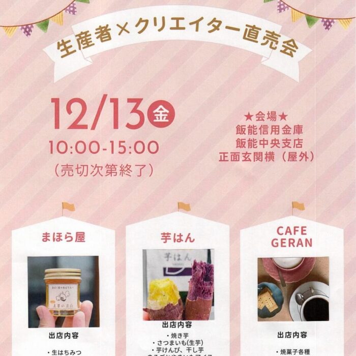 2024年12月14日 / 最終更新日時 : 2024年12月15日 sekitanaoko なおこのはんのう日記 『生産者×クリエーター直売会』が開催されました! 飯能信用金庫飯能中央支店のスペースにて行われました! たくさんの生産者や飲食店が出店。 市の複数の担当課で実現したそうです! 昨日は寒かったので焼き芋の匂いが最高でした! Follow me! BlueskyCopy