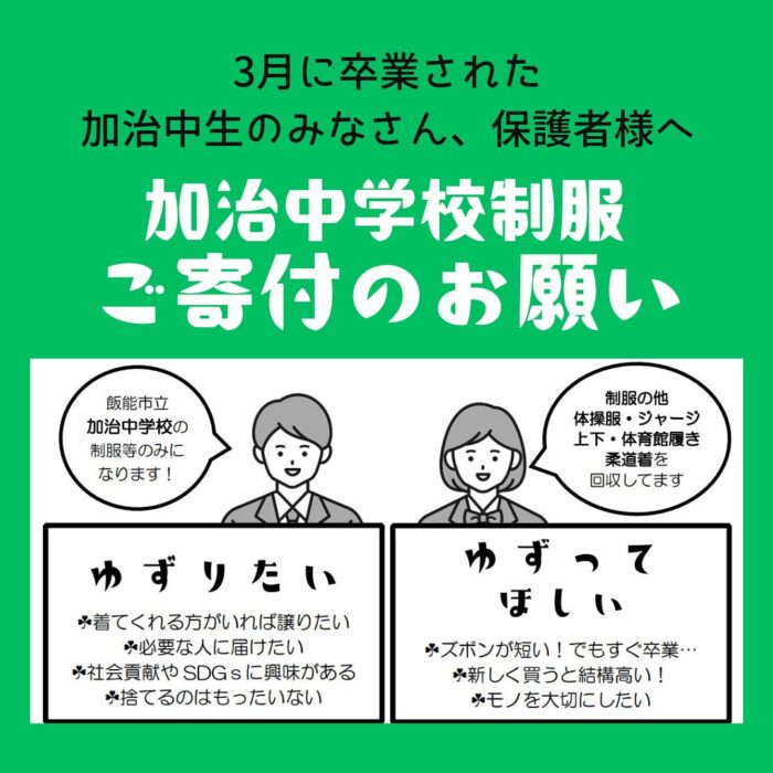 2025年3月29日 / 最終更新日時 : 2025年4月6日 sekitanaoko なおこのはんのう日記 加治中学校制服ご寄付のお願い 加治中学校卒業生の皆様・保護者様、 卒業式を終え進学準備にお忙しい事と思います。 さて、地域の仲間と運営している こどもの支援グループ〖みんなのいばしょkorokoro〗では 制服のリユース活動を行っております。 ご質問や相談はお気軽に受付ております。 私をフォローしてくれている加治中3年生のみなさん! ご協力お願いいたします Follow me! BlueskyCopy