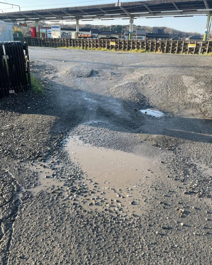 さて、相変わらず自動車、自転車、歩行者にとって危険な駅前。実際はロータリーでは無いのですがその役目を果たす駅前広場。舗装がなく、水溜まりや砂利が流れてきたりと環境としてはよくありません。