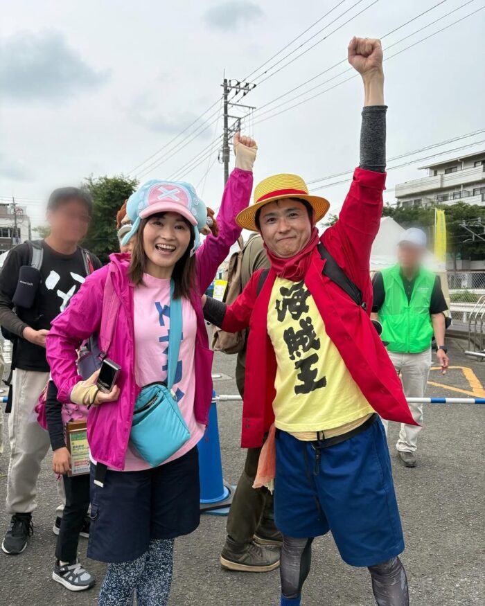 昨日1日目を終えました。開会式ではステージを彩ってくださる『花花』さん、加治中吹奏楽部、そして写真の海賊王・ルフィさん!が盛り上げてくださいました。私は10km出発式に参加後、地元加治地区の15キロコース休憩所へ。”ショートカット”オリジナルコースで向かいました。