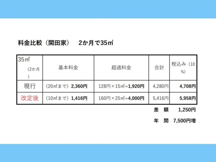 写真3枚目は関田家の実際の使用料(2ヶ月平均35㎥)から新料金を算出し、現行との差額を示したものです。