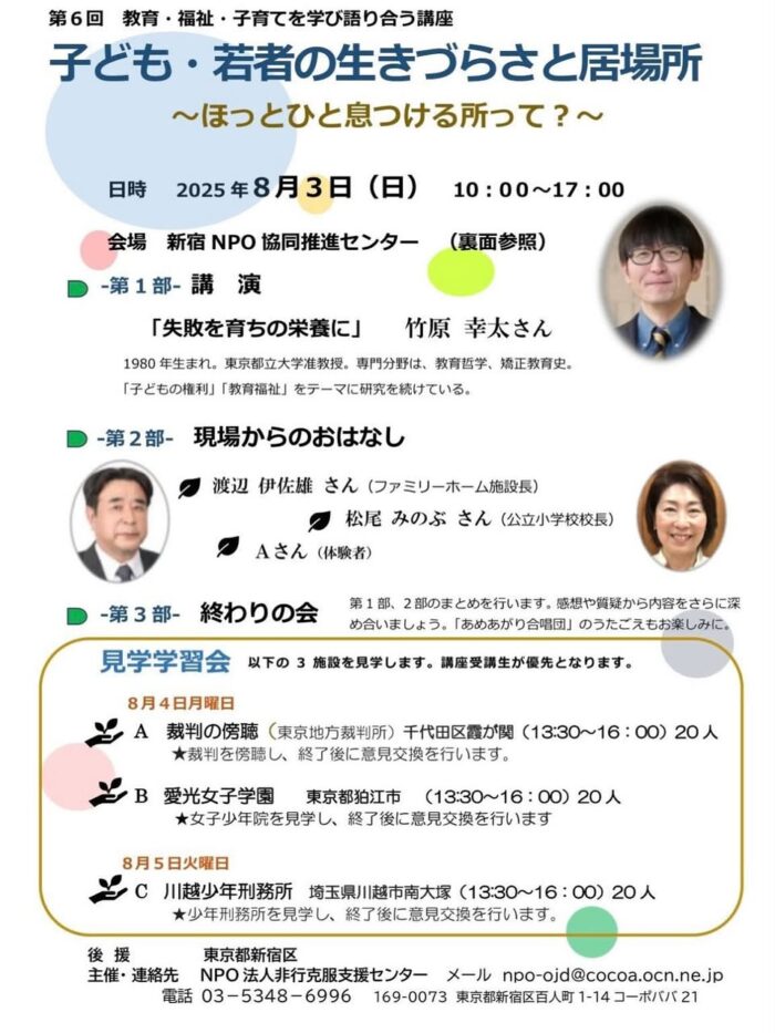 先日、名栗小学校の校長先生のお話しを聞きたく、また、若者の居場所を作る為の参考にしたいと「子ども・若者の生きづらさと居場所」講座を受講いたしました。主催がNPO非行克服支援センターとの事で、今まで知識として入れていなかった目線を学びたかったこともあります。