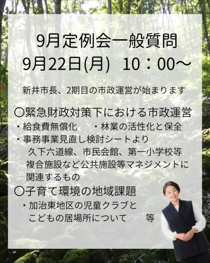 2025年9月22日 / 最終更新日時 : 2025年10月2日 sekitanaoko なおこのはんのう日記 関田なおこの一般質問 9月22日(月)10時から緊急財政対策下という厳しい状況のなか、新井市長の公約の実現性や公約の内容について質問してまいります。 Follow me! BlueskyCopy