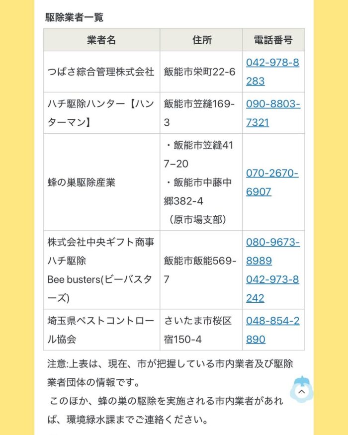 写真に市で把握している駆除業者様を載せましたの参考にしてくだされば幸いです!スズメバチは怖いので十分注意してください。ちなみに私、蜂蜜は大好きです。