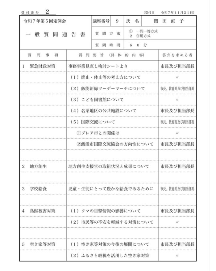 本日開会日を迎えました。報道等で飯能市の財政状況にご不安を持たれている方も多くいらっしゃることと思います。今回はどの議員の一般質問にも緊急財政対策関連が含まれております。私は12月9日(火)11時10分から登壇いたします。