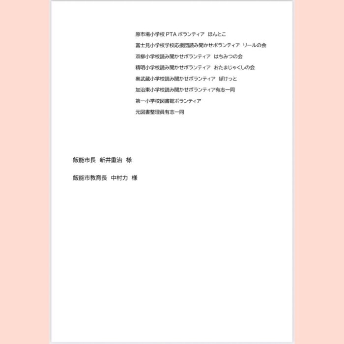 長きにわたり、お話し会等の開催をしているボランティアグループの方々が立ち上がり、坂井議員、熊田議員、パタソン議員、関田で話を伺いながら、存続希望の旨の要望書を作成し、18日に市長に提出いたしました。