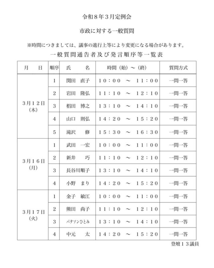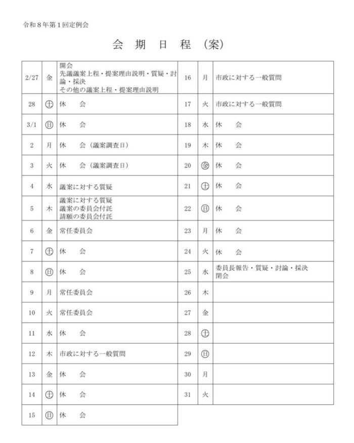 2026年2月24日 / 最終更新日時 : 2026年3月3日 sekitanaoko なおこのはんのう日記 飯能市議会3月定例会 本日議会運営委員会が開催され、議会日程が決定いたしました。 一般質問の通告書はこちら↓↓↓ リンクはこちら 議案内容は開会日の27日にHPに掲載されます。 Follow me! BlueskyCopy